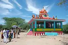 The shrines themselves vary by deity and region. For Tamils, Ayyanar is represented in an open space to better fulfill his duty. However there the goddess is given her own temple similar in form, and sometimes size, to a Vedic temple.[3] In other regions, however, the goddess (since gods are less venerated in these areas) may be given a shrine at the edge of the village, although it is common to find the shrine next to a tree or a snake-hole. In Telugu regions, the deity sometimes has no permanent shrine, but a temporary pandal. Some goddesses wish to be in the open space to feel the same hardships as their devotees.[6] Yet there is no distinction between the dwelling-place of the deity and the deity: the dwelling-place itself is a form of the deity.