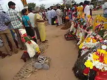 The sacrifice takes place near the end of the village festival. The animal is doused with water, and if it shivers, it is deemed to be possessed by the deity. Then, the animal is led to the shrine, and is restrained. One man takes an aruval or other sword and beheads the animal, which is then tossed aside to twitch and bleed out. For fowl, the head can be ripped off or the neck be broken without the use of a weapon. The head itself is placed in front of the deity with a foreleg in its mouth. It is believed that in this position the animal represents a demon, and by giving the demon to the deity it will be able to unite with her and become one again. Thus the villagers have done their duty.[2][3][4] The meat is then taken and is used to make a prasada, which is then offered to the deity. Afterwards, it is eaten by the devotees. It was usually the Dalits who got the meat from the buffalo sacrifice since only they would eat buffalo meat. At other times, however, anyone can walk up to the deity and make a sacrifice to them, potentially to ease some personal trouble such as a sick child or obtaining bad luck. The Muthumariamman temple in the Nilgiris was once the place where people swore solemn vows. This was sometimes used by the judicial system in the region during British times, and it was common for witnesses to make a vow of truth and make a sacrifice to Muthumariamman in the presence of a court official, so that all would know they spoke the truth.[7]