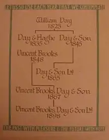 Vincent Brooks had started negotiating to take over the business of Day & Son Ltd during 1866.[20] Financially assisted by the Henry Graves, the Printseller of Pall Mall,[2] Vincent Brooks bought their property, name, and goodwill in an agreement dated 25 March 1867.[21] The firm now became known as Vincent Brooks, Day & Son.[20]