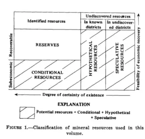 - ↑ McKelvey, V. E. (1972). "Mineral Resource Estimates and Public Policy: Better Methods for Estimating the Magnitude of Potential Mineral Resources Are Needed to Provide the Knowledge That Should Guide the Design of Many Key Public Policies". American Scientist. 60 (1): 32–40. JSTOR 27842943. Retrieved September 2, 2021.