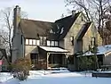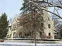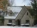 As limestone workers and owners, the residents of Vinegar Hill naturally looked to limestone as the material for their own houses.[2]: 89 They used these materials to construct residences in a wide range of architectural styles, including American Craftsman, Neoclassical, and Art Deco. Inside, the houses were also ornate: many feature mantels and balusters of carven stone,[3] and the four houses built by Christopher Donato also include elaborate transoms and lintels. The most prominent houses in the neighborhood are the hilltop homes of the wealthy near the eastern end of the district; here may be found styles such as Tudor Revival and Georgian-influenced Colonial Revival.[2]: 90 Throughout the district, many houses are found in various forms of Colonial and English Revivals,[4] and multiple Spanish Colonial Revivals are among the most significant residences of the lower part of the hill. Among the books that have concentrated on the architecture of Vinegar Hill is Carol Shields' novel The Stone Diaries, in which the neighborhood is part of the setting for much of the novel.[2]: 91