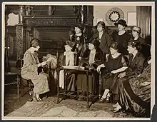 Photograph of a 1925 meeting, with Alice Paul on the left, Virginia Crawford sitting one from the right, of the British Section of an International Advisory Committee to the National Woman's Party[18]