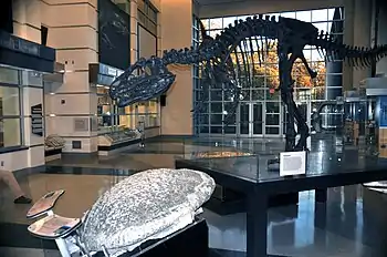 Fossil displays at the Virginia Museum of Natural History. In the foreground is a large Thrombolite-stromatolite (1.9 m diameter). In the background, the skeleton of a theropod dinosaur.