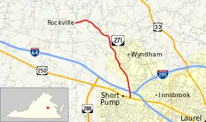 SR 271 begins at an intersection with US 250 (Broad Street) in the suburban community of Short Pump in western Henrico County. The road continues south as Pump Road. The state highway heads north as a four-lane divided highway to the east of Short Pump Town Center and crosses over Interstate 64 (I-64) just west of its western interchange with I-295. SR 271 reduces to a two-lane undivided road north of the overpass and passes along the western edge of the suburban community of Wyndham. The road temporarily becomes a four-lane divided highway again by turning left at its perpendicular intersection with Nuckols Road. SR 271 leaves the suburban area as a two-lane road that cuts through the northeastern corner of Goochland County near the headwaters of the Chickahominy River to the east before entering Hanover County. The state highway continues west to its northern terminus at the intersection of SR 620 and SR 622 in the village of Rockville. SR 622 heads south as Rockville Road and north as Walnut Hill Drive; SR 620 heads west as Dogwood Trail Road.[1][2]