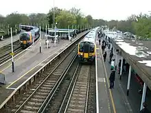 Trains from Weybridge (left) and Reading (right) await departure for London Waterloo at Virginia Water