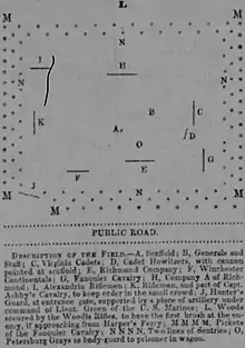 A second artist from Frank Leslie's Illustrated Newspaper was also in attendance,[17] and Harper's Weekly employed a local artist and nephew of Prosecuting Attorney Andrew Hunter, Porte Crayon (David Hunter Strother);[18][19] one of his drawings is in the Gallery, below. Leslie informed his readers that "one of our imitators" was publishing bogus pictures. He described how his paper had engravers and artists standing by in a New York hotel, and once a sketch had arrived from Charles Town, 16 artists worked simultaneously at transforming it (split into 16 segments) into an illustration ready to be printed.[20] The illustrations were so widely distributed that Yale Literary Magazine made fun of them, publishing the drawings of "our own artist on the spot" of "Governor Wise's shoes", "John Brown's watch", and the like.[21]