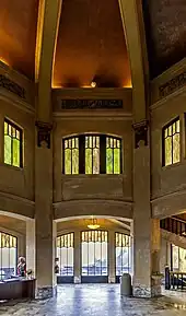 The Vista House was designed by Edgar M. Lazarus, a renowned Oregon architect. With its high-grade marble interior and brass fixtures, some Oregonians at the time derided it as the "$100,000 Outhouse" during its construction.[6] The initial funds for the project, allocated by the public, had totaled $3,812.35.[7] According to an itemized list published by the Oregon Historical Society, the building itself eventually cost approximately $70,000, with an additional $9,000 for the accompanying rock wall; $8,000 for paving and gradation; $6,000 to the architect; and $3,000 for other miscellaneous costs.[7]