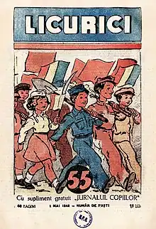 Cavarnali's version of Mother had three separate editions between 1947 and 1950.[50] In December 1947, when he became tenured at Matei Basarab National College,[51] his rendition of a poem by the Soviet Kirghiz Temirkul Umetaliev appeared in Graiul Nou, the Soviet–Romanian propaganda magazine.[52] Upon the establishment of a communist regime later that month, Cavarnali began working as an editor for another young reader's publication, Licurici ("Firefly"); his colleagues there included Mihai Stoian, who had grown up reading Înainte, and who describes Cavarnali as one whose leading trait was "compassion", and who "never dared burden anyone with his presence."[13] In January 1949, he was assigned to the Public Education Ministry as a reviewer in the Youth Education Directorate, part of a team led by Amos Bradu.[53] In March 1949, he was a rapporteur at the National Writers' Conference, which established a Writers' Union of Romania (USR)—he appeared there alongside Cruceanu, Mihail Davidoglu, Victor Eftimiu, Ioanichie Olteanu, Sașa Pană, Cicerone Theodorescu, and Haralamb Zincă.[54] His sister had followed him to Bucharest, where she became Davidoglu's wife.[9][10]