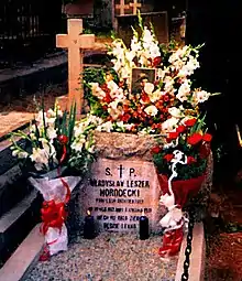 In 1928, on the invitation of the same company, Horodecki moved to Tehran, becoming a chief architect of the Syndicate on the Design of Persian Railways. He designed in particular the building of the Tehran railway station. In 1930 he died and was buried at Doulab Catholic Cemetery in Tehran. His epitaph is inscribed in Polish with only the phrase Profesor architektury. Niech mu obca ziemia będzie lekka., which translates into English as "Professor of architecture. Let the foreign earth be light for him."