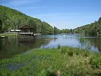 The area is populated with white-tailed deer, grouse and raccoon. The deer population, which was extirpated by 1895, has rebounded since re-introduction by park ranger Arthur Woody during the 1930s.[19] Over 100 species of birds inhabit or migrate through the area, including native songbirds such as the Canada warbler, Blackburnian, black-throated blue, black-throated green and chestnut-sided warblers. Also found are hawks, owls, woodpeckers, kinglets, thrushes, vireos, cuckoos, phoebes, chickadees, titmice, nuthatches, brown creepers, wrens, tanagers, grosbeaks, indigo buntings and red crossbills.[20] Migratory species are present during the late spring and early fall, making the area popular among birdwatchers The creeks surrounding the lake are rich with species of salamanders.[21]