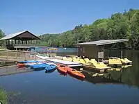 The centerpiece of the park is Lake Trahlyta. The lake has a swimming beach and boat launch for non-motorized watercraft, and offers seasonal rentals for pedal boats, kayaks, and paddle boards. It contains bass and bream and is stocked periodically during each trout season with about 5,000 trout.[11] Also at the park are a general store, miniature golf course and a Civilian Conservation Corps museum.