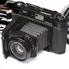 After the Voigtländer name was licensed to Cosina, the Bessa III aka Bessa 667 was released in 2008, which offered dual-format (6×7 and 6×6) images in a folding body with a coupled rangefinder that adjusts for parallax. A rebadged version was sold by Fujifilm as the GF670.[20] Later, a wide-angle version was sold, omitting the folding ability, as the 667W, with a 55 mm f/4.5 Color-Skopar lens.[21] The Bessa III line was discontinued in 2014.