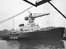 While the new icebreaker was being built, the state-owned icebreaker fleet had become a powerful strike weapon for Niilo Wälläri, the chairman of the Finnish Seamen's Union. By the early 1950s, the strikes had become so common that they were sometimes considered a normal part of the arrival of winter. It was also jokingly said that a new icebreaker strike could be predicted simply by looking at the thermometer—the "strike limit" would be reached when the temperature dropped low enough for the seas to freeze.[7] When Wälläri announced a new strike in 1953, the Finnish Government decided to take action as the icebreaker strikes effectively stopped all foreign trade during the winter months, causing major losses for the Finnish industry. In Sweden, the state-owned icebreakers were part of the Swedish Navy and thus were not allowed to go on strike. On 9 February 1954, only four days before Voima was commissioned, it was decided to move the new icebreaker under the Finnish Navy, where it would replace the 77-year-old Von Döbeln as the supply ship for the torpedo boats during the summer months. During the icebreaking season, the ship would still be crewed by the Navy, but used to escort merchant ships under the command of the Finnish Maritime Administration.[3][8]