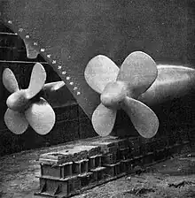 The propeller shafts that connect the propulsion motors to the four-bladed steel propellers and the rudder stock all have a diameter of 400 millimetres (16 in). The 3.5-metre (11 ft 6 in) bow propellers weigh 8,360 kilograms (18,430 lb) while the bigger stern propellers have a diameter of 4.2-metre (13 ft 9 in) and weigh 9,800 kilograms (21,600 lb) each.[3] Both the propellers and the propeller shafts were retained in the refit.[22] The original steering arrangement, a single center rudder mounted at the sternpost,[12] was also retained although newer icebreakers have twin rudders for improved manoeuvrability.