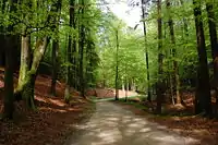 The original entrance tree avenue from the 19th century is continuous with the central part of the park and is geometrically formed in a French style. Other parts are in English style. The geometrical park, designed in 1918 by Leo Souvan, stood front of the mansion. The park leads up to the old park in the immediate vicinity of the former mansion. Two stone tables are surrounded by two horse chestnut trees and two plane trees, all originating in the 19th century.