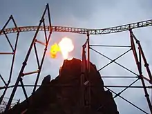 Volcano's layout simulated the path of a volcanic eruption. Upon boarding one of three trains at the base of the mountain, riders made a slow turn left out of the station. The train then moved into its first of two launch tracks, which accelerated the train to 70 miles per hour (110 km/h).[7] During the first launch, the on-ride camera took photos of the riders. After making a sweeping 200-degree turn behind the mountain, the train entered the second launch tunnel, followed by a vertical section ending in a "roll out" element. The "roll out", similar to a sidewinder, was a vertical section of track followed by a quarter loop to bring the train completely upside down, then a loose half-corkscrew. According to Roller Coaster DataBase, the roll out element was unique to Volcano.[22]