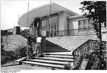 Between 1957 and 1958, the Café am Weinberg building was constructed on the elevated plateau, offering visitors a panoramic view of the park.[2] The building was designed by Hans Jahrig and Max Kowohl. In the southwestern corner of the park, a kidney-shaped pond was laid out, surrounded by a central lawn for sunbathing. The park occupied a special position in the Berlin green plan of the 1950s, as it is the only park of its size and consistently independent formal form, at a time when the restoration or renewal of war-damaged parks was the city's main focus.