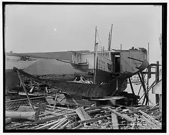 Soon after the Cup races, Volunteer was bought by John Malcolm Forbes (who also owned Puritan) and was Re-rigged as a schooner in 1891. On August 21, 1893, she went onto the rocks at Hadley's Harbor, Naushon Island, off the coast of Massachusetts.[6] Damage was extensive, as shown in the picture below. In 1894, in anticipation of racing with the British Valkyrie, she was returned to her original sloop rig.[7] She was broken up at a New York junkyard in 1910.