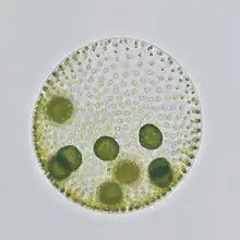 The Volvocaceae are a family of unicellular or colonial biflagellates, including the typical genus Volvox. The family was named by Ehrenberg in 1834,[1] and is known in older classifications as the Volvocidae. All species are colonial and inhabit freshwater environments.