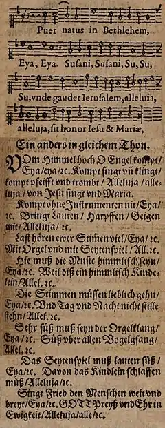 The song from the beginning of the Thirty Years War may have been a reaction to the troubles of the war.[6] The melody was derived from a version of "Puer natus in Bethlehem" which appeared in 1616 in a hymnal in Paderborn.[7] Its Latin text was replaced by new poetry, while the repeated parts such as "Eia, Susani" and "Alleluja" were kept.