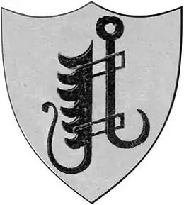 The coat of arms shows a fireplace trammel hook. On the helmet with black and silver covers is standing a natural short oak branch with hanging green leaves on both sides.