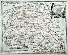 In 1367, the Ostens bought the lordship of Plathe in Hinterpommern from the Wedells. In 1577, Wedige von der Osten was forced to sell the old family castle and a part of the city to Hermann von Blücher. The Ostens then built a new castle a few hundred meters away, which belonged to the family until they were expelled in 1945. However, the current "New Castle" is only a building from the early 20th century, except for a side wing. From the 17th century to 1817, there was the Osten- and Blücher circle around Plathe, so named because of the two families with the largest property. The divided lordship over Plathe ended when Matthias Conrad von der Osten (1691-1748), Chief Financial Advisor and Chief President of the Kurmark War and Domains Chamber in Berlin,[8] married the last heir of the Plathener line of the Blüchers in 1731, thus reunifying the two properties. The circle was now called the "Osten Circle" and covered 37,750 hectares.[9]