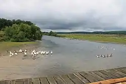 The valley of Vorsklytsia is trapezoidal with a width of 4–5 km (2.5–3.1 mi) and the river runs in great meanders. The floodplains are swampy, especially in the lower reaches, the right bank is often quite steep, the left bank rather low. The gradient of Vorsklytsia is 0.77 m/km. The river freezes in early December and remains frozen until mid-March.[1][2]