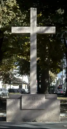 Vozarev Cross (Serbian: Возарев крст, romanized: Vozarev krst) is located in Belgrade, in the park between Vojvode Šupljikca Street and Mileševska Street (municipality of Vračar), and it was erected in 1847. It represents the immovable cultural property as the cultural monument.[1] The famous Belgrade bookseller and a printer, Gligorije Vozarević, erected a wooden cross decorated with icons in his own field at Vračar. The contemporaries interpreted the erection of the cross not only as the symbol of the faith and religion, but also as the symbol of the liberation – the symbol of the victory. For that reason, this cross is considered as the first public monument in Belgrade. The ruined wooden cross was replaced by the Belgrade Municipality in 1933 with one in red artificial stone. The part of Belgrade was named after it Crveni Krst (The Red Cross).[2]