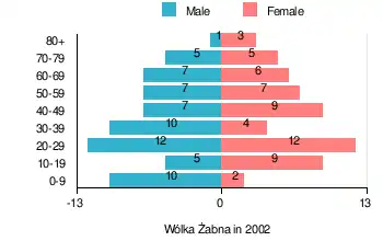 According to the 2002 Poland census, there were 121 people residing in Wólka Żabna village, of whom 52.9% were male and 47.1% were female. In the village, the population was spread out, with 17.4% under the age of 18, 43% from 18 to 44, 20.7% from 45 to 64, and 19% who were 65 years of age or older.[1]