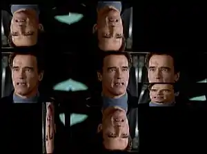 Video and audio of Arnold Schwarzenegger as Adam Gibson from The 6th Day is loosened up and reworked by a videomaker, subjecting him to "a cruel series of digital replications".[1]