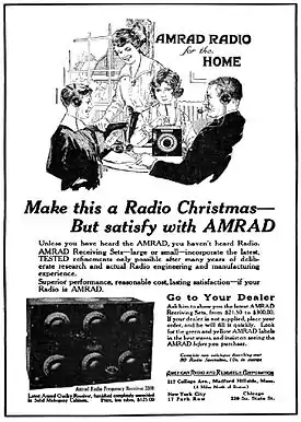 1XE was revived after the conclusion of the war, and the station reportedly began experimental voice and music broadcasts in 1919. However, information about any entertainment broadcasts, both before and immediately after World War One, is very limited. In 1930, one former employee remembered "playing phonograph records and reading jokes out of magazines in between pieces" beginning in the late summer of 1920.[11] A report in the November 21, 1920 Boston Globe reported that as a demonstration "a concert by radiophone will be given from the Medford radio station" the next day,[12] and a month later Filene's department store advertised the sale of radio receivers that were "a creation of a company out in Medford", and which had been used to listen "to a concert given in Medford".[13] However, during this period the broadcasts appear to have been irregularly conducted. AMRAD's primary focus after the war was adopting the radiotelephone for personal communication, and a November 1920 article about the company in the Boston Sunday Post reviewed the possibility of using wireless telephones for communication, particularly in automobiles, but didn't make any references to broadcasting activities.[14]