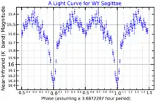 A near-infrared (K band) light curve for WY Sagittae, adapted from Somers et al. (1996).[8] The ordinate is linear in flux.