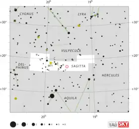 WY Sagittae, also known as Nova Sagittae 1783, is a star in the constellation Sagitta which had a nova eruption visible in 1783. It was discovered on 26 July 1783 by the French astronomer Joseph Lepaute D'Agelet. It is usually difficult to precisely identify novae that were discovered hundreds of years ago, because the positions were often vaguely reported (for example the discoverer may have only reported the constellation where the nova occurred) and historically there was not a clear distinction drawn between different sorts of transient astronomical events such as novae and comet apparitions.[5] However D'Agelet observed this nova with a mural quadrant, which produced coordinates accurate enough to allow modern astronomers to identify the star.[6] D'Agelet reported the apparent magnitude of the star as 6, but Benjamin Apthorp Gould, who analysed D'Agelet's records, determined that what D'Agelet called magnitude 6 corresponds to magnitude 5.4 ± 0.4 on the modern magnitude scale,[7] so the nova was visible to the naked eye.