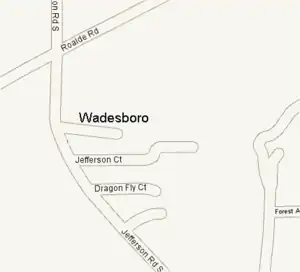 In broad geographic terms, Wadesboro is located between Highway 90 on the north, Interstate 10 on the south, Baum Road on the west, and State Road 59 on the east. More precisely, Wadesboro encompasses the neighborhoods of Wadesboro Road, Roalde Road, Holey Road, Jefferson Road South, Jefferson Court, Dragon Fly Court, Hickory Wind Road, and others in that locale.