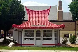 Early gas stations were small, ugly or utilitarian buildings that attracted little notice and even complaints from neighbors. Dodge hired Milwaukee architect Alexander C. Eschweiler to design eye-catching stations.[2] Inspired by Japanese culture, which was popular at the turn of the century, he created Wadham's signature pagoda.[2] As well as a prime example of Japonism, the design was one of the earlier examples of architecture forging a brand identity.