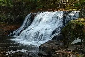 Two natural waterfalls lie within easy reach by park trails: the Big Falls,[7] on the Coginchaug River, and the Little Falls,[8] on Wadsworth Brook. The larger of the two, Wadsworth Big Falls, drops the 52-foot breadth of the Coginchaug River some 30 feet (9.1 m) over a shelf of Hampden basalt.[9] Wadsworth Little Falls is found along Wadsworth Brook and descends approximately 40 feet (12 m) over an outcrop of sandstone known as Portland arkose.[9]
