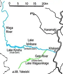 The Waga River (和賀川, Waga-gawa) is a river in Iwate Prefecture, Japan. From its headwaters near Mt. Waga in the Ōu Mountains it flows from north to south through the entire length of Nishiwaga Town before turning east through Kitakami City. The River enters the Kitakami River on the south side of the city opposite Mt. Otoko.