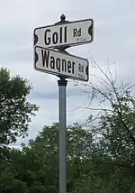 Sign for Wagner Road at the intersection with Goll Road in Wagner