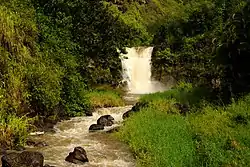 The Waimea River is a river in Honolulu County on the island of Oʻahu in the U.S. state of Hawaii. The river's main channel is 1.5 miles (2.4 km) long and has a watershed spanning 13.6 square miles, with a total length of 24.4 km (15.2 mi) when its tributaries are included.[1][2] It is formed by the confluence of the Kamananui stream and the Kaiwikoʻele stream northeast of Haleiwa and flows northwest through the Waimea Valley to the Pacific Ocean at Waimea Bay. The name Waimea translates to "red water."[3]