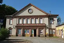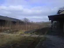 Waldheim station was opened in 1852 when the line between Limmritz and Chemnitz, the last section of the Riesa–Chemnitz railway, was opened. Despite the fact that two branch lines — the Waldheim–Rochlitz railway and the Waldheim–Kriebethal railway which was opened 1896 - joined the mainline here, the track plan of this junction station remained comparatively simple. In the last years of the line there was only one track with a run-around loop for the locomotives of the Rochlitz trains. They used the island platform which at this time had remained the only platform in the station (a second platform without a canopy had been removed when the mainline was re-doubled and electrified). The opposite side of the island platform was and still is used by the mainline trains between Riesa and Chemnitz. With the building work progressing, the Rochlitz track was joined to the mainline, too, but is hardly used any more. The station building had stood empty and suffered from increasing decay for several years until most of it was demolished in 2015, leaving only the porticus.[22][23] The long goods shed and the engine shed that was accessible via a turntable are also abandoned and decaying. The engine shed used to house locomotives for shunting duties and for the freight services to the paper mills in the Zschopau valley. Some team tracks have remained in use for a few years after closure of the WR line,[24][18] but now (2016) only a passing loop and two crossovers between the mainline tracks are left beside the latter.[25]