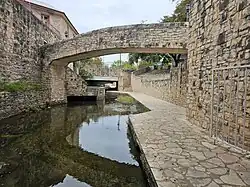 In 1929 the creek was rerouted to its present route to allow for the creation of what is now known as Palm Park, one block east of the present day Austin Convention Center.[2][3] Palm Park, in turn, was named after the nearby Palm School, which was a city run elementary school that operated from 1887 to 1976 and, in fact, was the largest elementary school in Austin in 1928.[4]