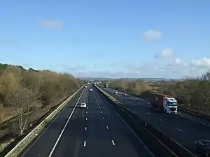![]() Looking east along the M62 across the site of the former station (2018) | |