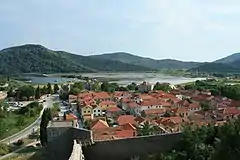 The Walls of Ston (Croatian: Stonske zidine) are a series of defensive stone walls, originally more than 7 kilometres (4.3 mi) long, that surrounded and protected the city of Ston, in Dalmatia, part of the Republic of Ragusa, in what is now southern Croatia.[1] Their construction was begun in 1358.[2] On the Field Gate of the Walls (Poljska vrata) there is a Latin inscription which dates from 1506. Today, it is one of the longest preserved fortification systems in the world.[3]