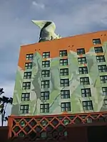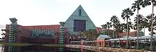 The Walt Disney World Dolphin is a resort hotel located between Epcot and Disney's Hollywood Studios in the Walt Disney World Resort in Bay Lake, Florida. It is the sister resort of the Walt Disney World Swan. Both hotels were designed by Michael Graves. The Dolphin opened on June 4, 1990, as part of a joint venture between the Walt Disney Company, Tishman Hotel Corporation, MetLife and Starwood Hotels and Resorts, which was merged into Marriott International in 2019.[1] The land the resort occupies is owned by the Walt Disney Company, while the buildings themselves are leased by Disney to the Tishman Hotel Corporation and MetLife but operated by Marriott International under the Sheraton Hotels and Resorts brand. The Walt Disney World Swan and Dolphin are a part of the Walt Disney Collection of resorts; because of this they are Disney branded and guests of the resort have access to special Disney benefits available to Disney Resort Hotel guests only.