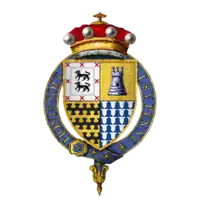 Arms of Sir Walter Blount, 1st Baron Mountjoy, KG: Quarterly, 1st: Argent, two wolves passant sable on a bordure of the first eight saltires gules (Ayala); 2nd: Or, a tower azure (Mountjoy); 3rd: Barry undé or and sable (Blount); 4th: Vair (Gresley).