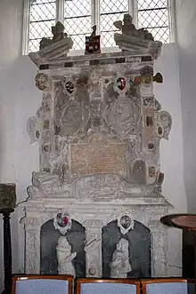 - Thomas Erle (d.1597), eldest son,[14] whose large effigy dressed in full-armour and kneeling on one knee in prayer, survives (re-positioned) in St Mary's Church, Morden, Dorset, the parish church of Charborough House. In 1581 at Shute in Devon, he married Dorothy Pole, a daughter of his father's near neighbour William Pole (1515–1587), Esquire, MP, of Shute House in the parish of Shute, near Colyton, Devon. Dorothy's brother was the Devon antiquary and historian Sir William Pole (1561–1635) whose principal seat was Colcombe House in the parish of Colyton, the former residence of Walter Erle of which mansion house and deerpark a lease had been granted to him by the Queen Catherine Parr. Pole describes various of the Erle family's landholdings in his work Collections Towards a Description of the County of Devon.[26] Dorothy's mother was Katherine Popham (died 1588), the sister of John Popham (1531–1607), Lord Chief Justice. Dorothy survived her husband and remarried to Sir Walter Vaughan (c.1572-1639), of Falstone (alias Fallersdon) in the parish of Bishopstone, Wiltshire, Sheriff of Wiltshire in 1599-1600 and a Member of Parliament for Wiltshire in 1606.[27] Thomas Erle commenced building a pier at Axmouth,[28] which manor had been acquired by his father. By his wife he had children including: