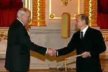 From July 2005 to early 2010, Walter Jürgen Schmid was German ambassador to Moscow,[1] and he presented his Letter of Credence to then-President of Russia Vladimir Putin on 8 November 2005.[4] He was succeeded by Ulrich Brandenburg.[5]