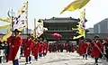 The guards wore royal uniforms, carried traditional weapons, and played traditional instruments.[3] The Sumunjang and Sujongjang wore and plate and mail armor (gyeongbeongap, Korean: 경번갑; Hanja: 鏡幡甲) and the Gapsa wore dudumiggap (Korean: 두두미갑; Hanja: 頭頭味甲), a ceremonial armor that does not provide protection in battle.[4]