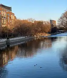 Wangjing area mainly features plain topography. In the north, the Beixiao River runs from west to east. There are mounds in the east which are probably the Wangjing Dun that was used for military affairs in the Ming Dynasty. On the west and south, there are more than ten connected parks and green spaces.[18]