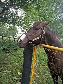 War Front is a bay horse bred by Joseph Allen and was foaled on February 11, 2002 at Claiborne Farm in Paris, Kentucky.[1][2] He was sired by Danzig, who won three minor races, but was then retired to stud undefeated as a result of knee problems. He went on to become a successful stallion and was champion sire of North America in 1991, 1992 and 1993. Amongst his other progeny are Chief's Crown, Dance Smartly, Danehill, Dayjur, Green Desert, Hard Spun and Lure.[3] War Front's dam is Starry Dreamer, a daughter of Rubiano who won six races and was placed in a number of graded races.[4] War Front was trained by H. Allen Jerkens.[5] At maturity he reached 15.3 hands (63 inches, 160 cm) high.[6]